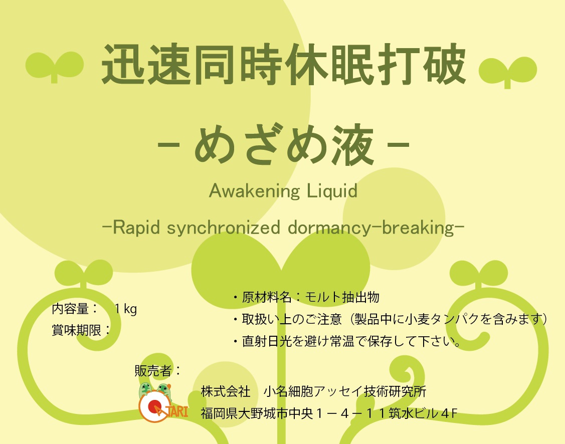 休眠して(眠って)いる植物の赤ちゃんの種や球根を、独自製法により5日以内で同時にめざめさせる液を販売!お手元での新規6次化の資材開発に!5千円/kgで希釈して使用。1kgから販売。食品添加物で安全。