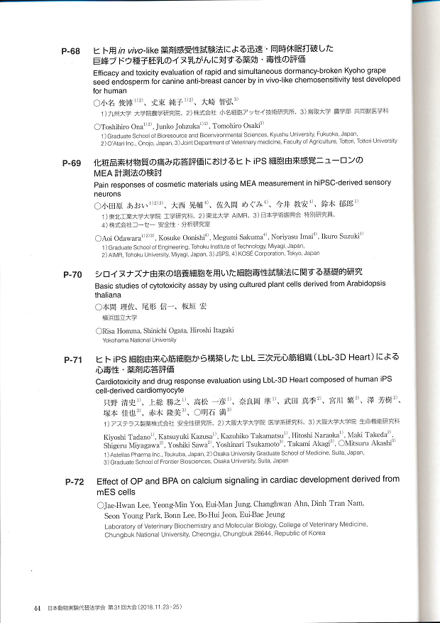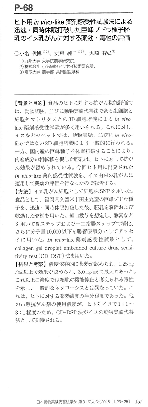 日本動物実験代替法学会第31回大会 参加・発表 未分類 への投稿 01/30/2019 投稿者:ona@oatari-inc.com (01/30/2019更新) 国内産の巨峰種子を休眠打破することにより、内容成分の相転移を促した胚乳は、ヒトに対して抗がん効果が認められている。今回ヒト用に開発されたin vivo-like薬剤感受性試験を、イヌ由来の乳がんに適用して抗がん効果を確認した。
